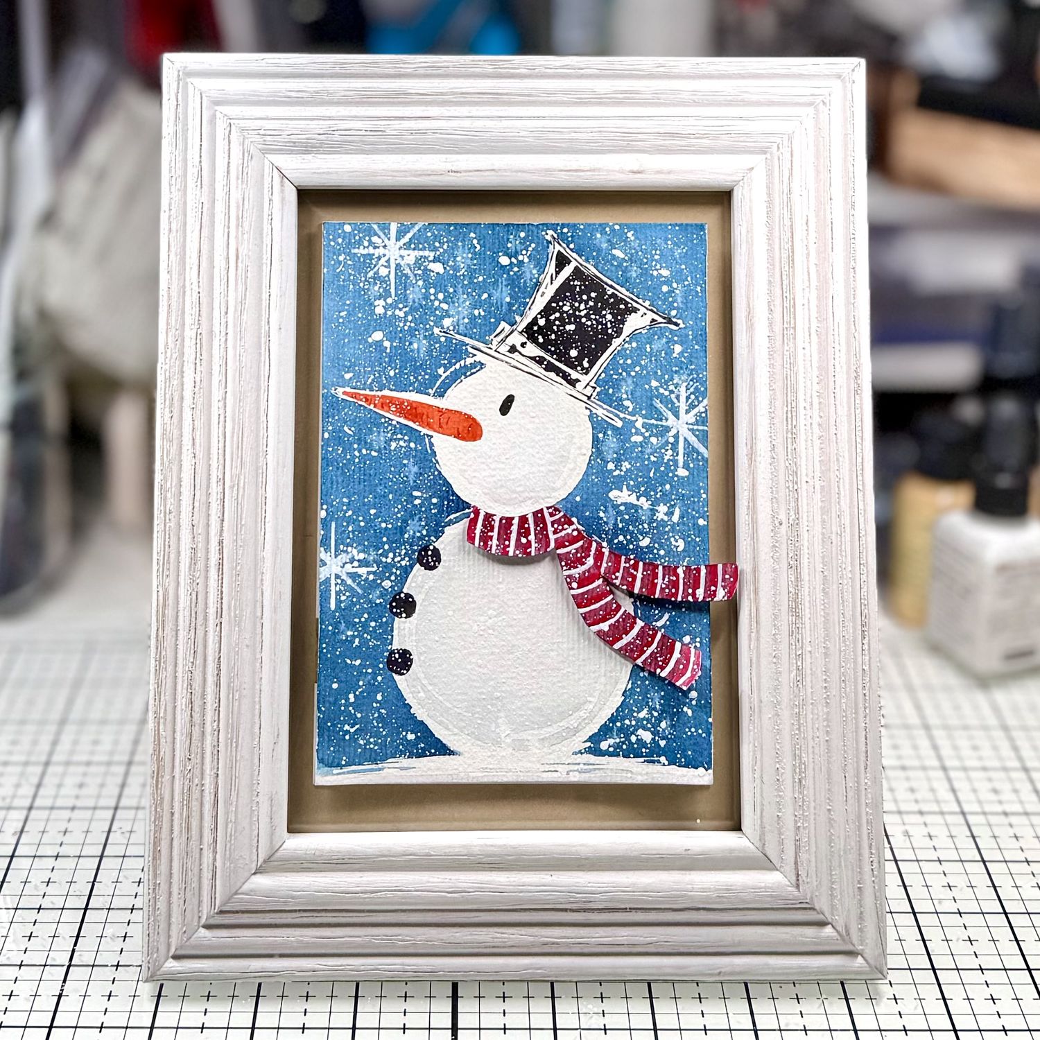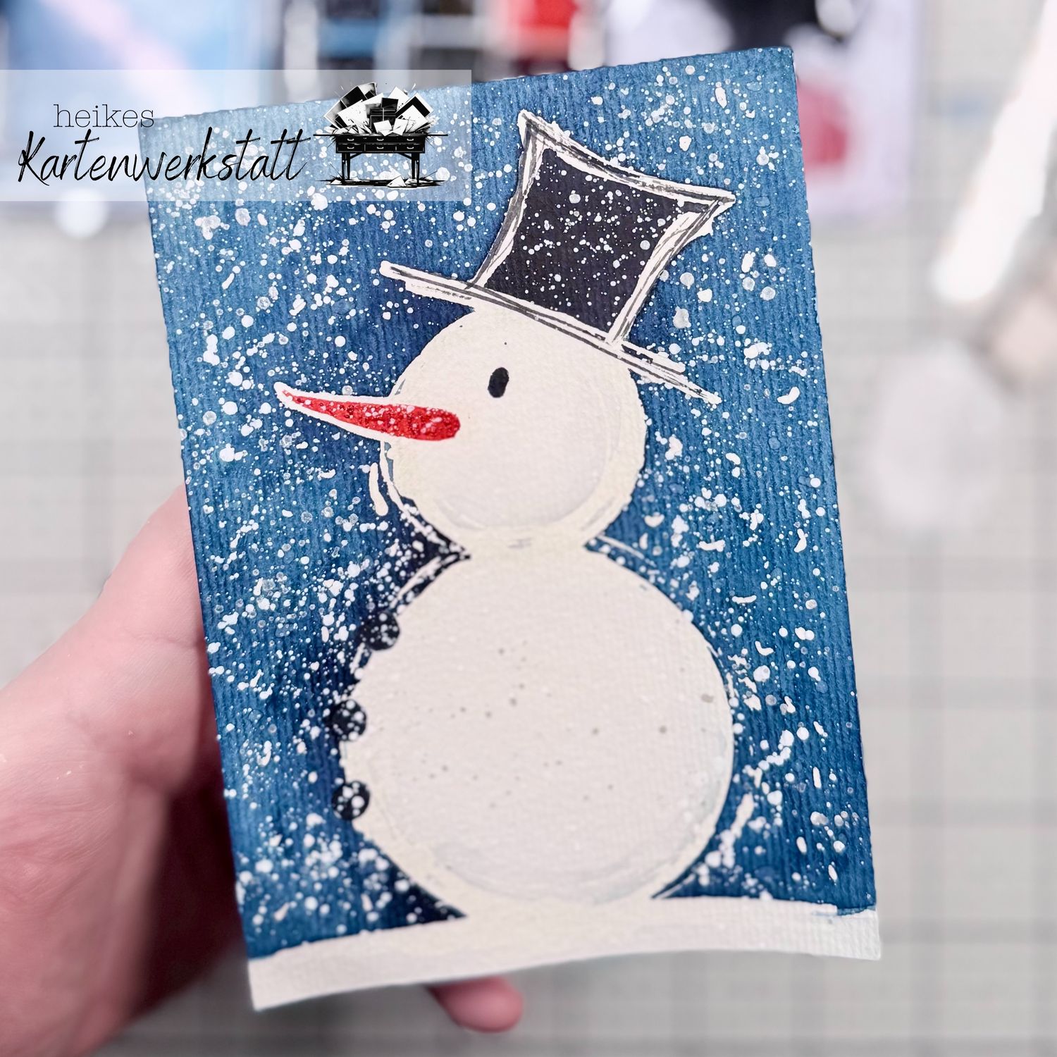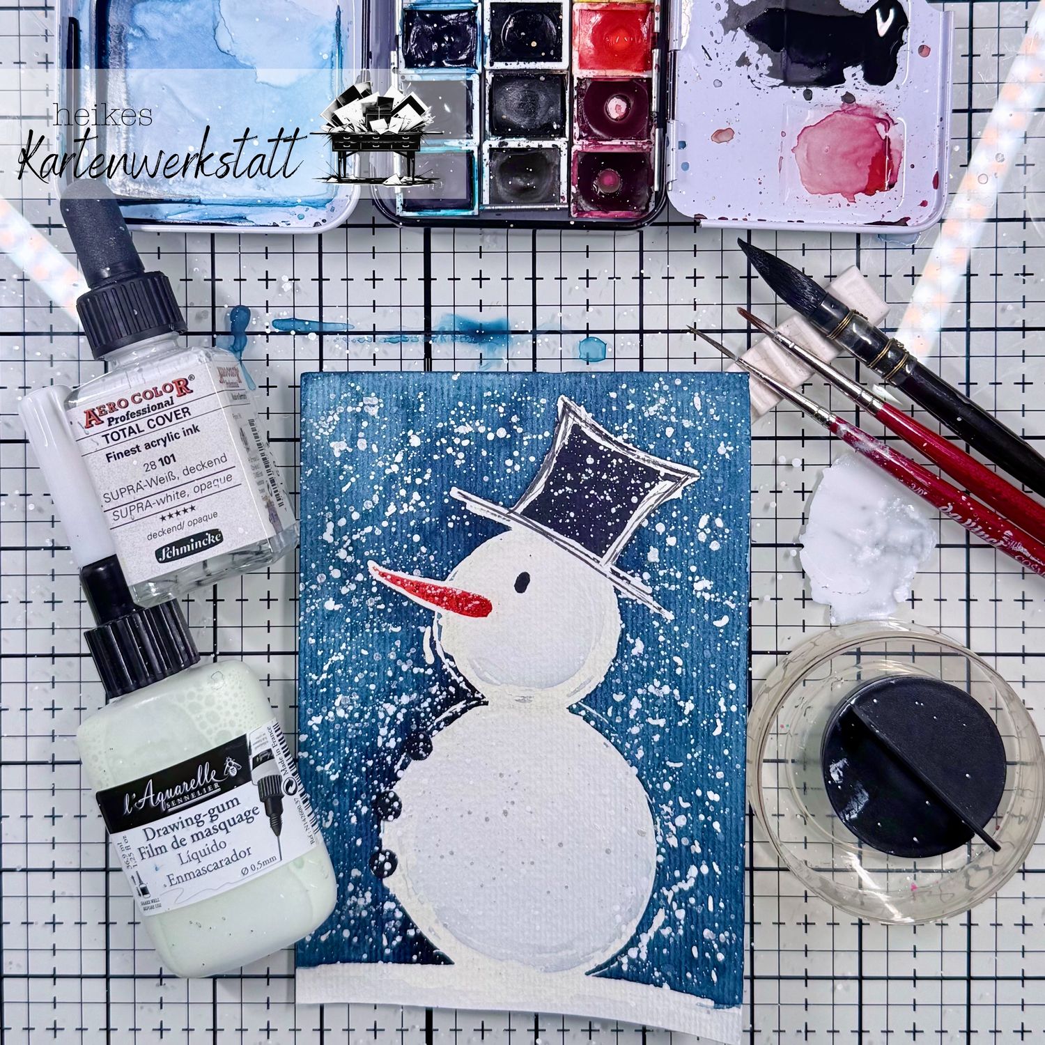 Lerne, wie man ohne Zeichenerfahrung einen Schneemann mit Maskier-Flüssigkeit und Aquarellfarben zaubern kann (alternativ mit weißer Acrylfarbe).